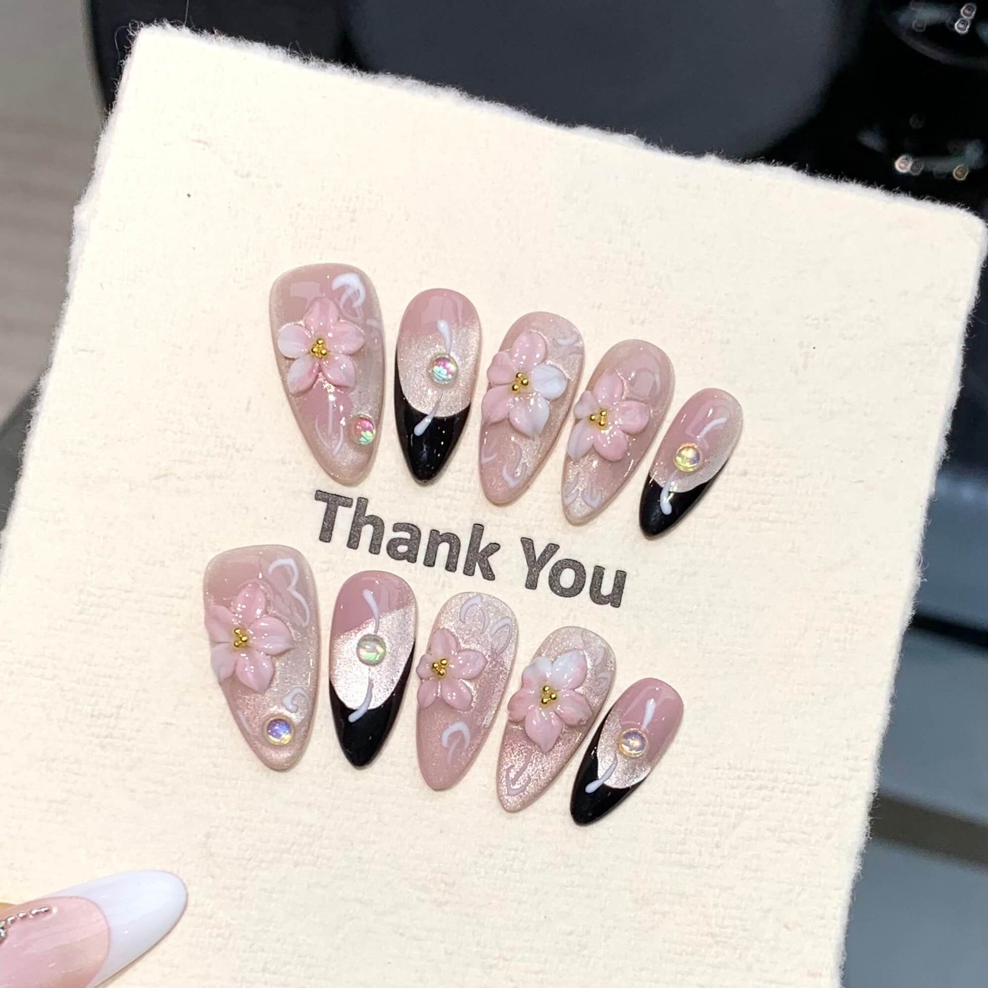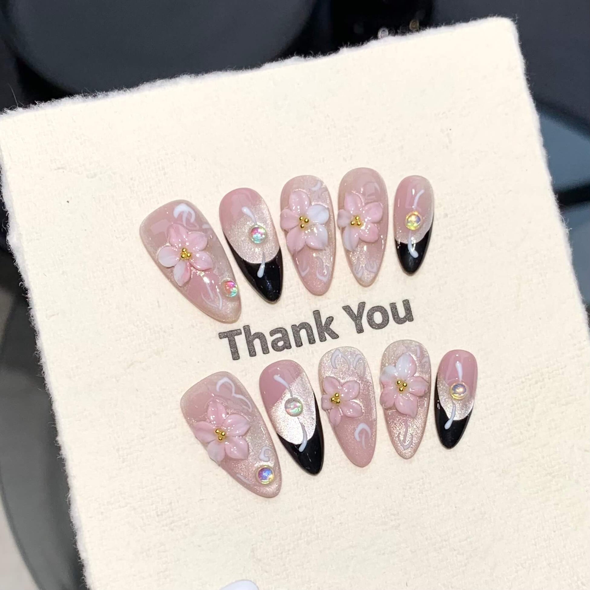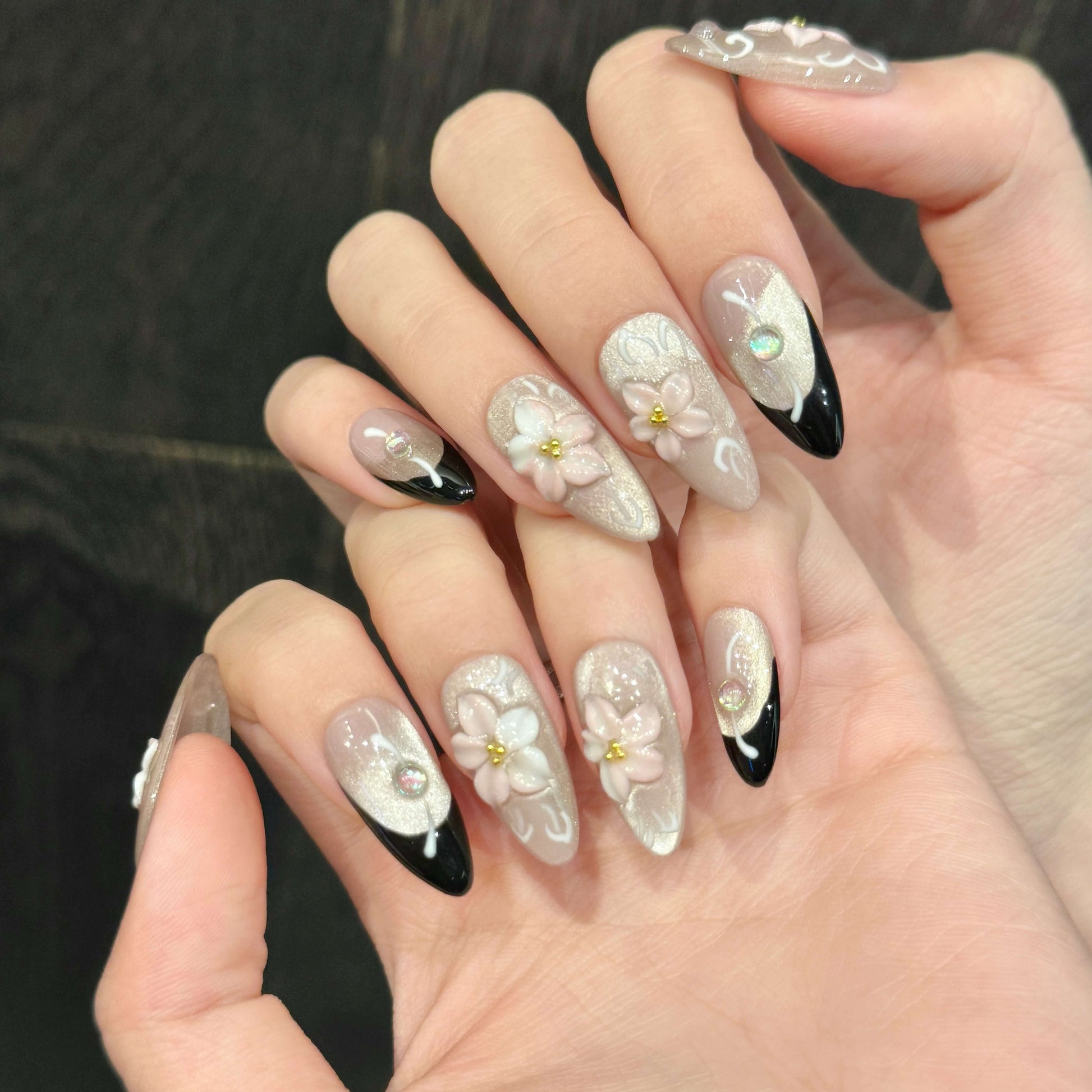 「アーモンドネイル×3Dフラワー×ブラックフレンチ|甘さとクールが溶け合うアートネイルチップ」