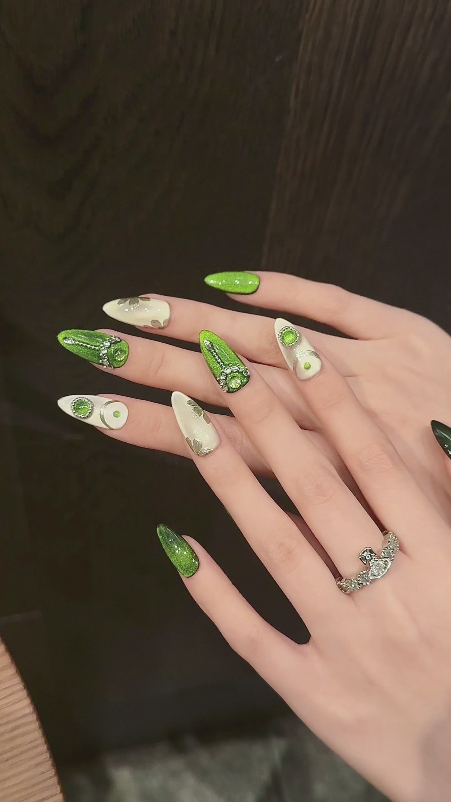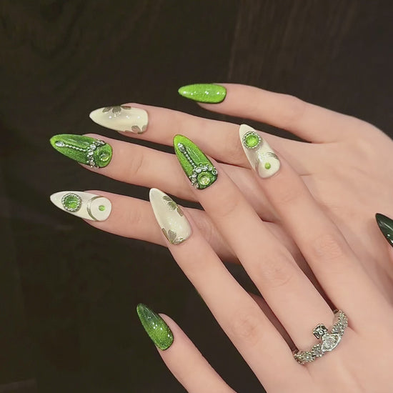 エメラルドグリーン×ミラーホワイト|ジュエリー級の輝き放つゴージャスネイルチップ
