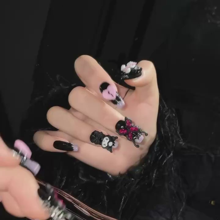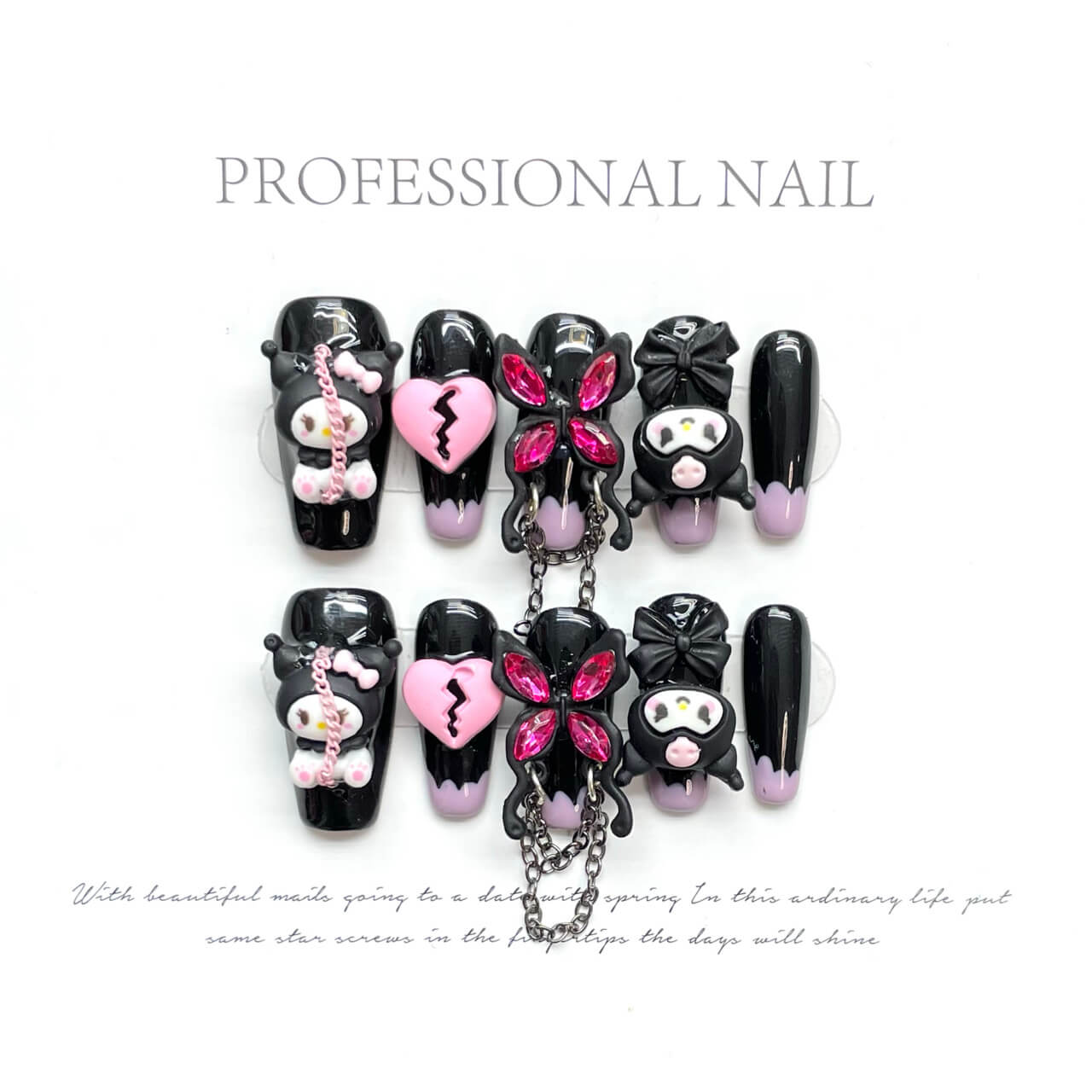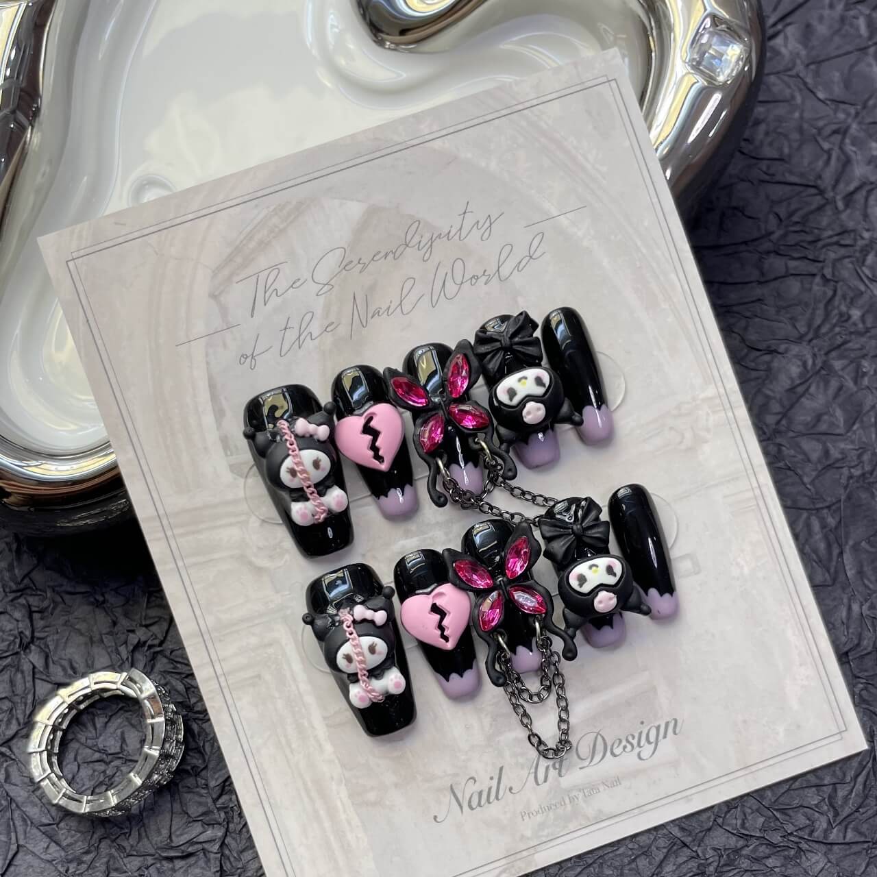 「クロミ風×地雷系ブラックネイル|壊れたハートとチェーンが揺れる甘辛ネイルチップ」