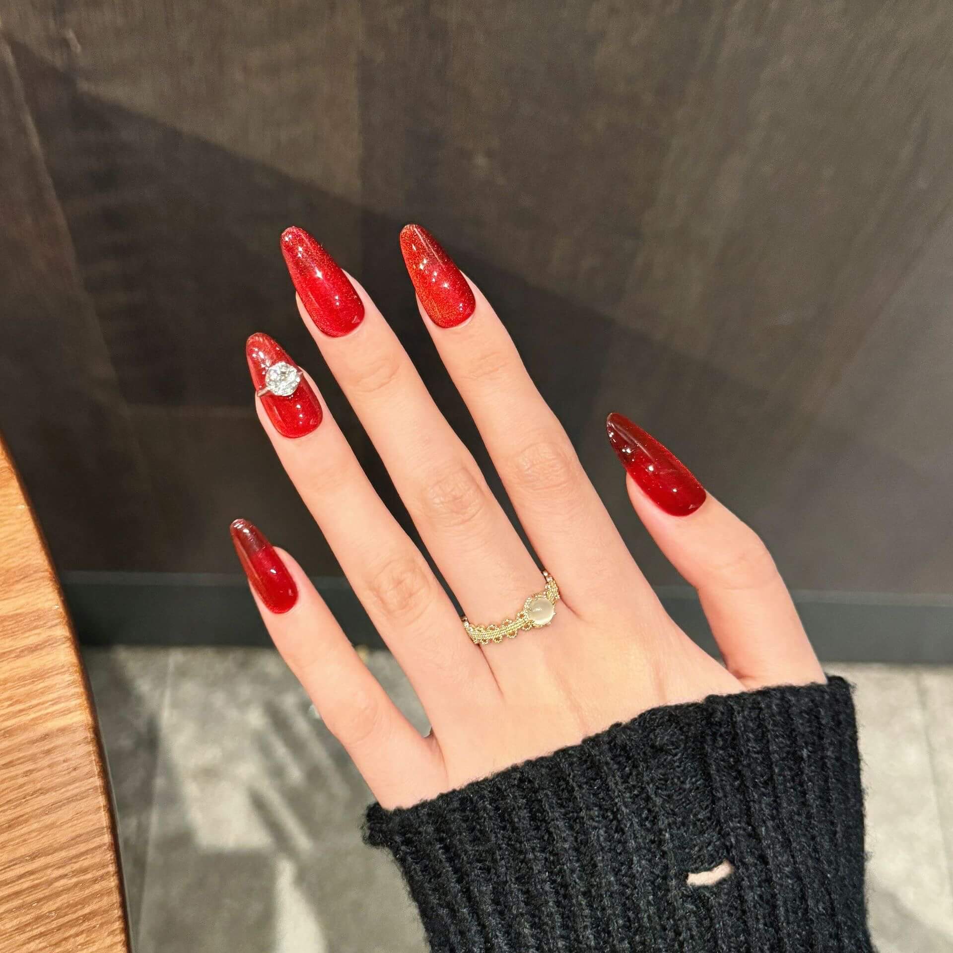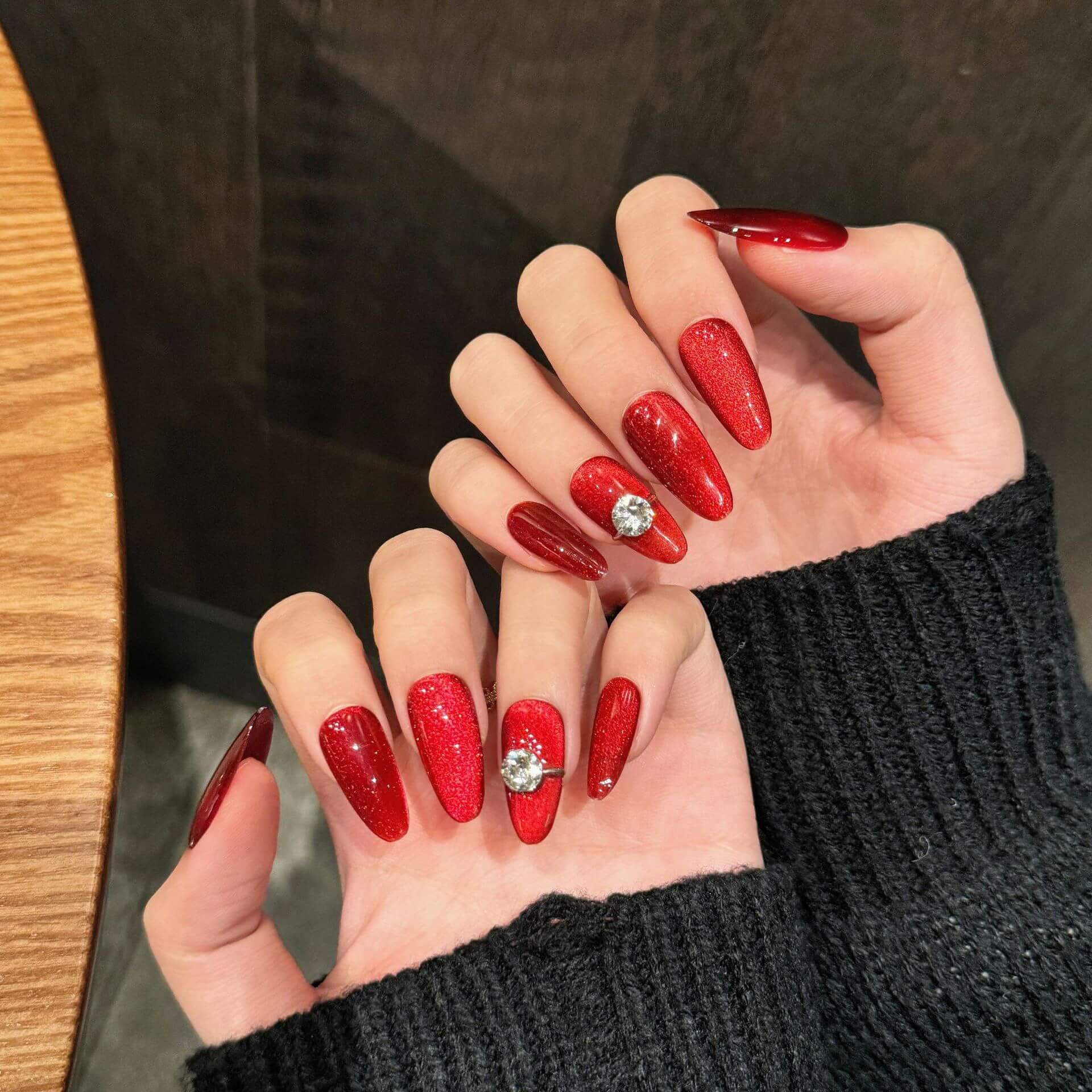 グリッターレッド×ミディアムオーバル|光を纏う主役級ネイルチップ