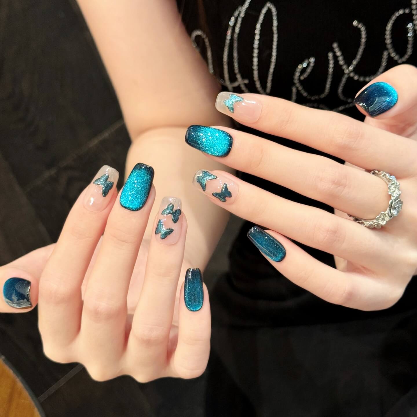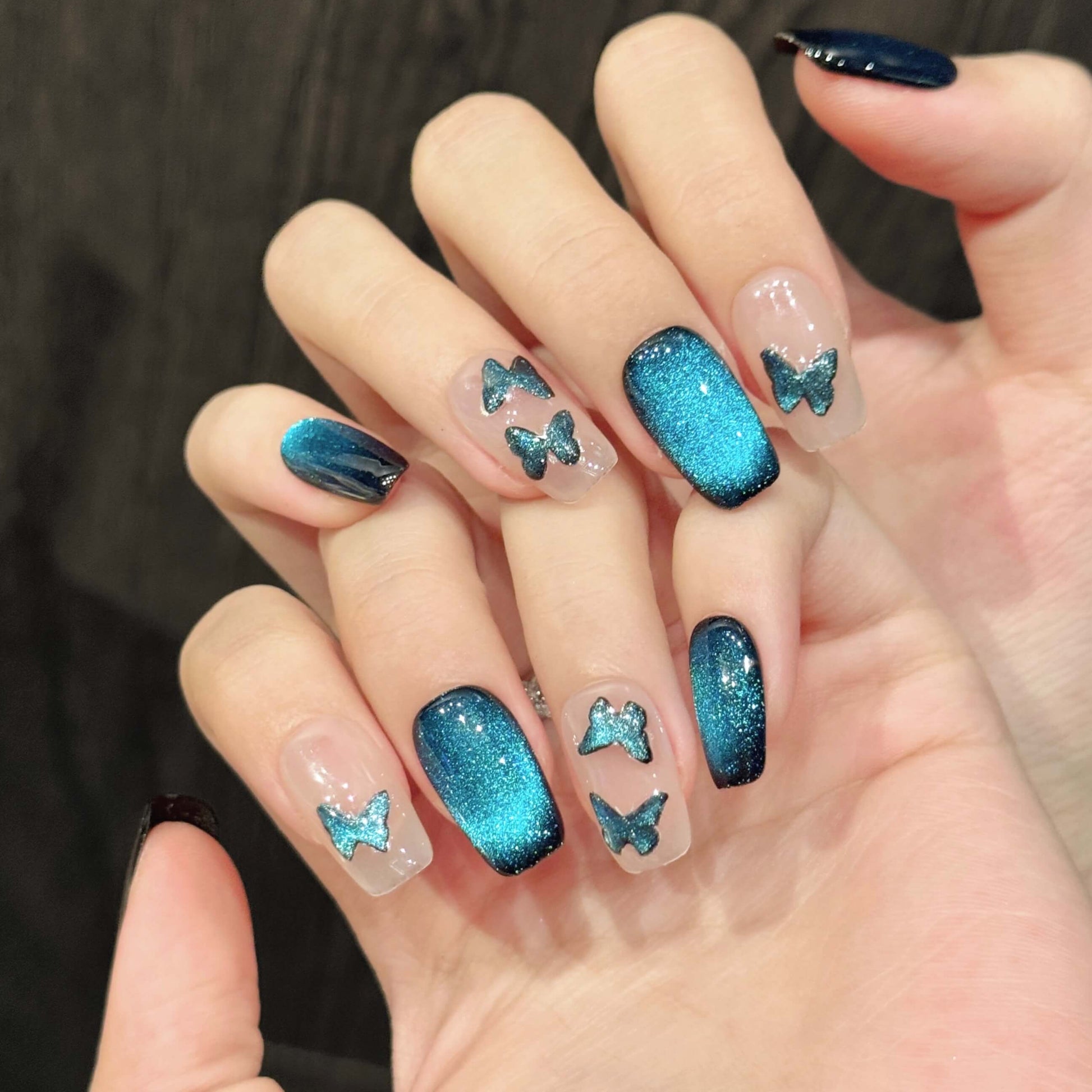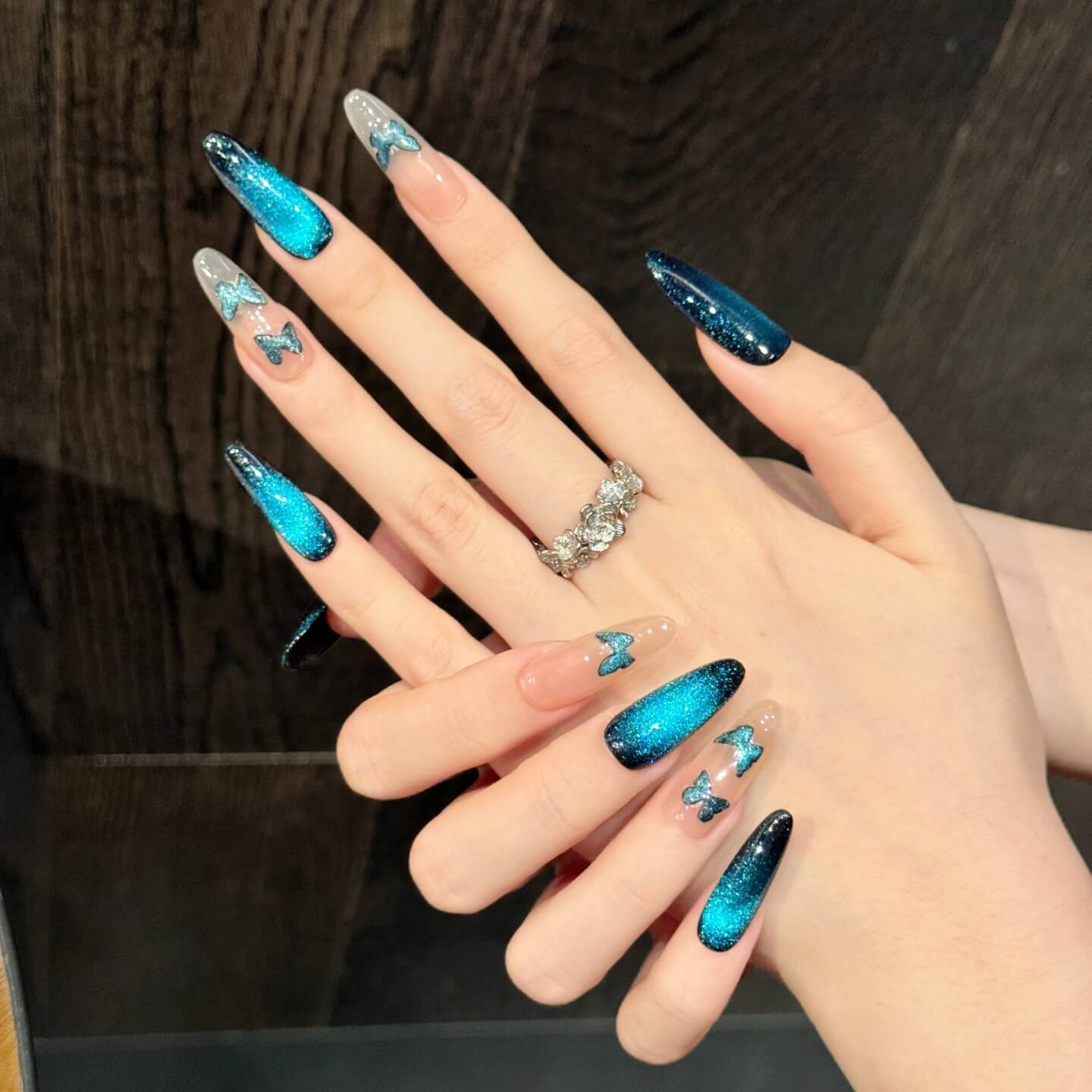 ✨エレガントでミステリアスなブルー系マグネットグラデーションに、立体感のあるキラキラの蝶々をプラスしたデザイン。