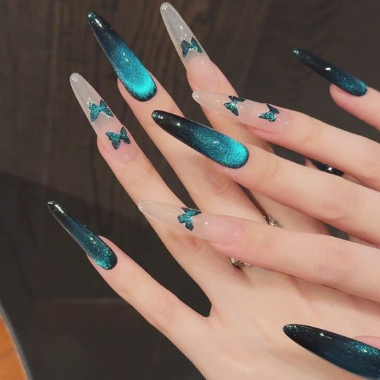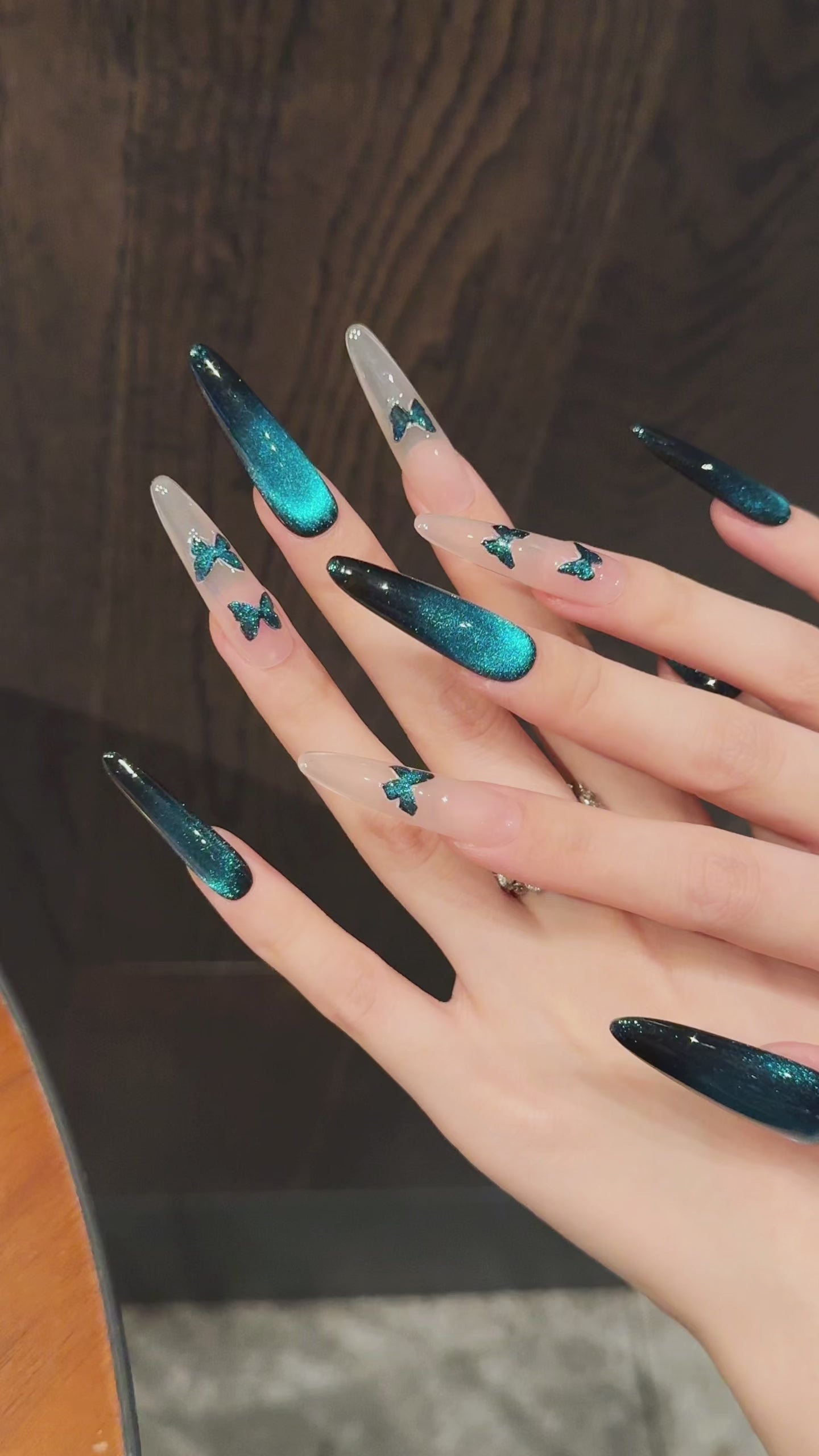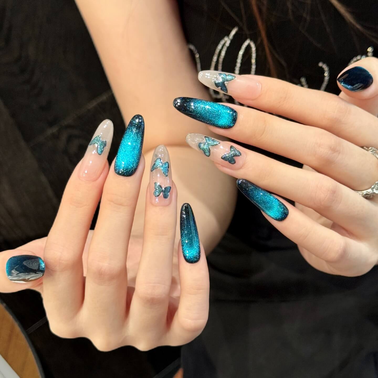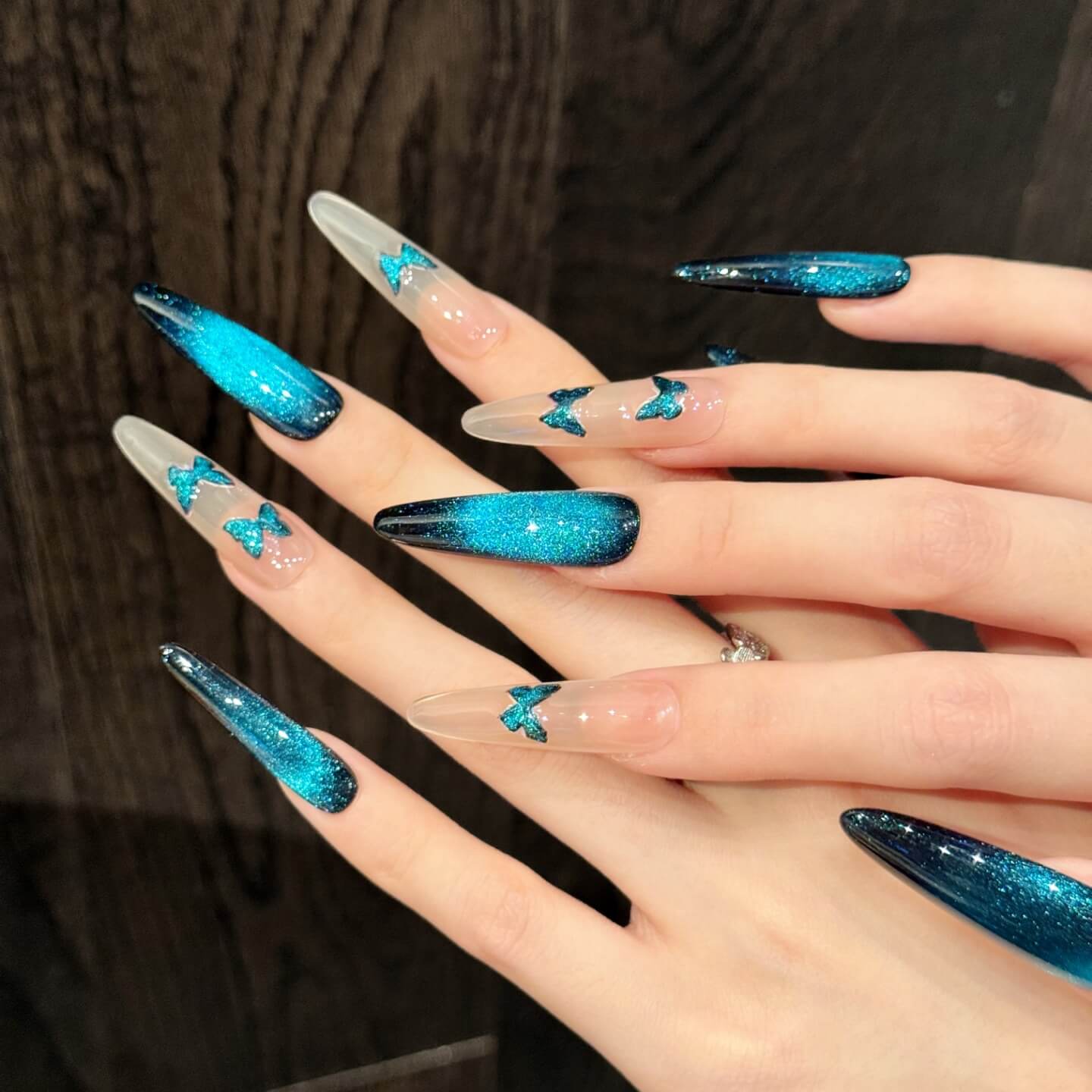 ✨エレガントでミステリアスなブルー系マグネットグラデーションに、立体感のあるキラキラの蝶々をプラスしたデザイン。