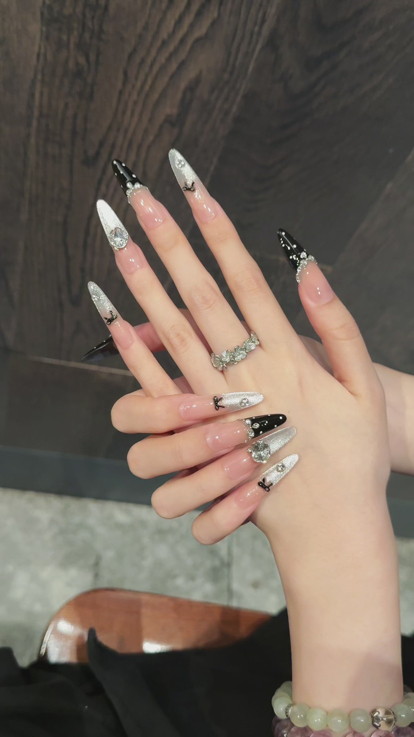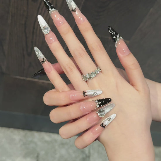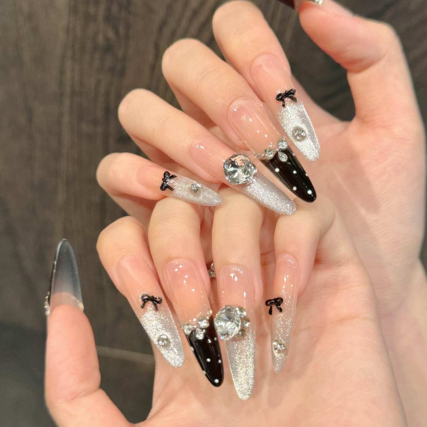 ブラック×シルバーの姫系ビジューネイル|リボン付きロングスティレットチップ