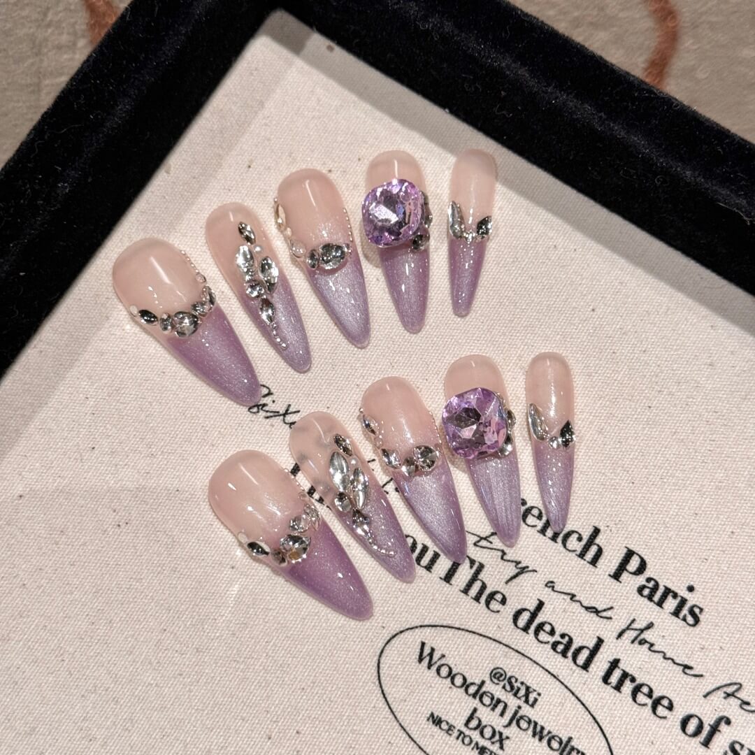 ロングスティレット×ラベンダーグラデ|ビジュー煌めくフェアリープリンセスネイルチップ