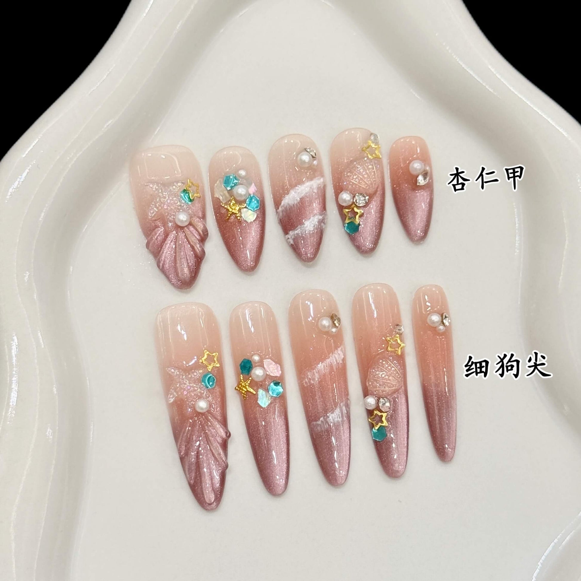 夏限定・海のきらめきネイル|パール&シェル付きオーロラチップ
